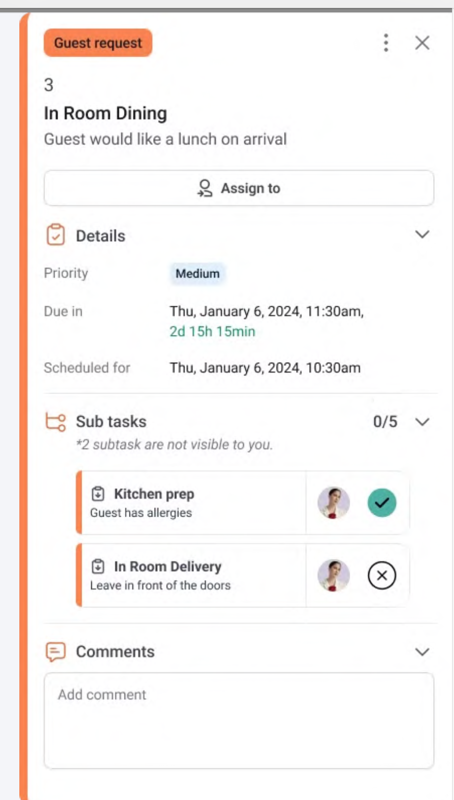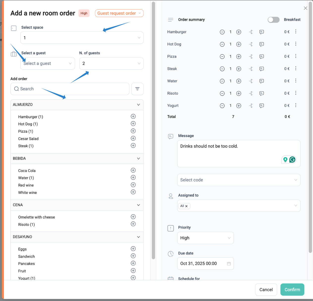 Optionally, add a comment or message for the kitchen or room service (e.g., “Drink not too cold” or “Steak well done”).