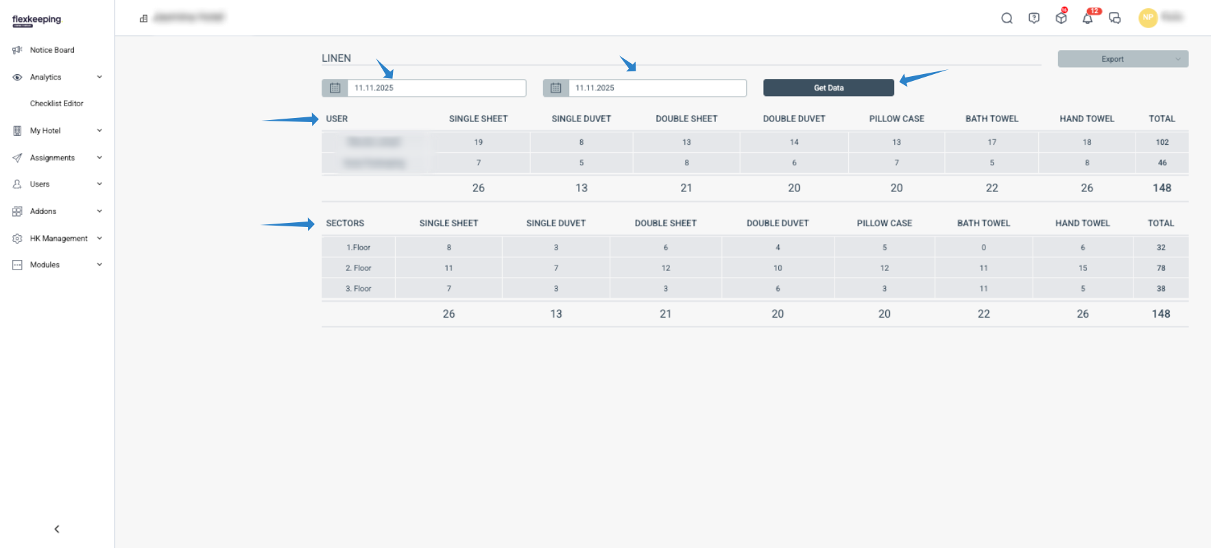 The Laundry overview page provides detailed information about laundry consumption, either per user or per hotel sector. You can access it here: Laundry Overview.
