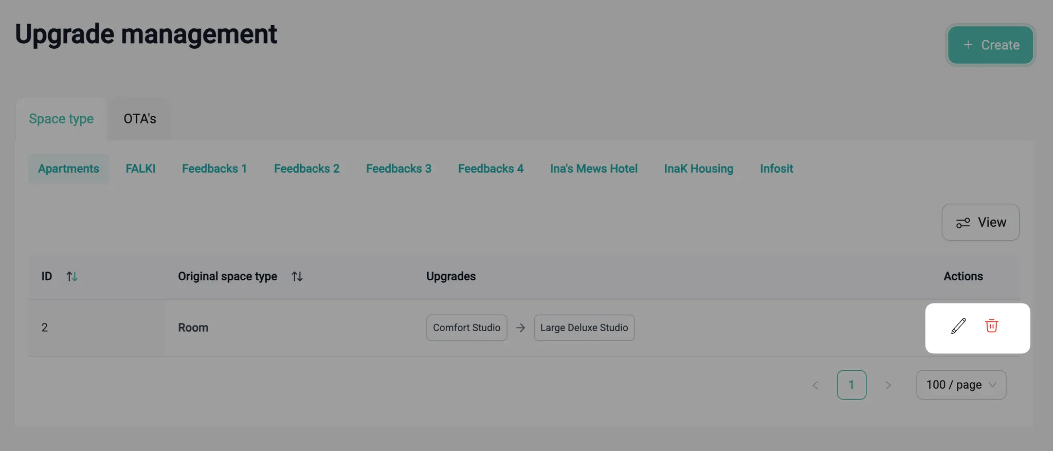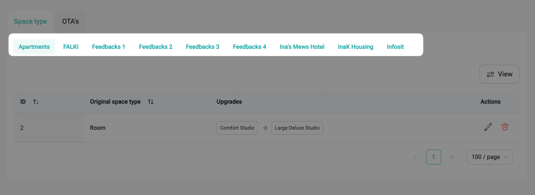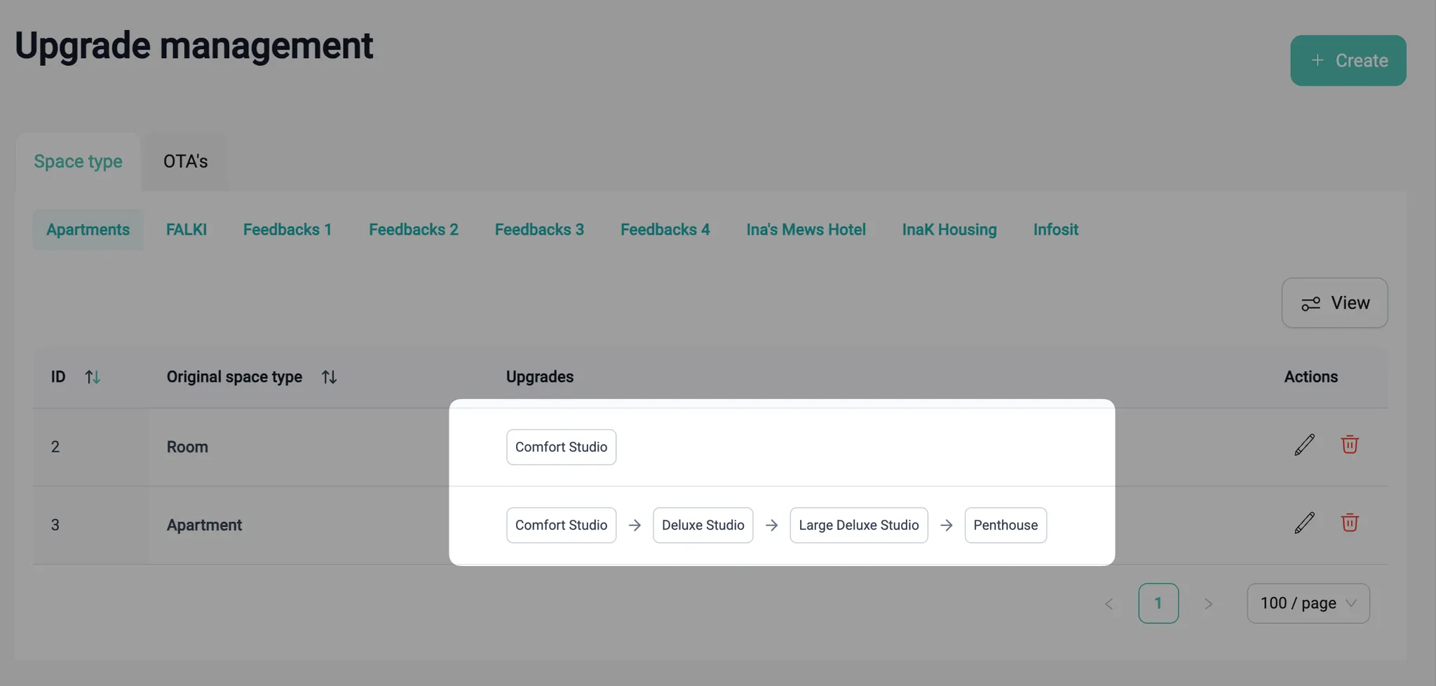 Using the Upgrade Predictions Editor, you can set up a unique ranking system for upgrades. The “Space Types” tab allows you to define a hierarchy of possible upgrades for room types. For example, Standard → Superior → Deluxe.