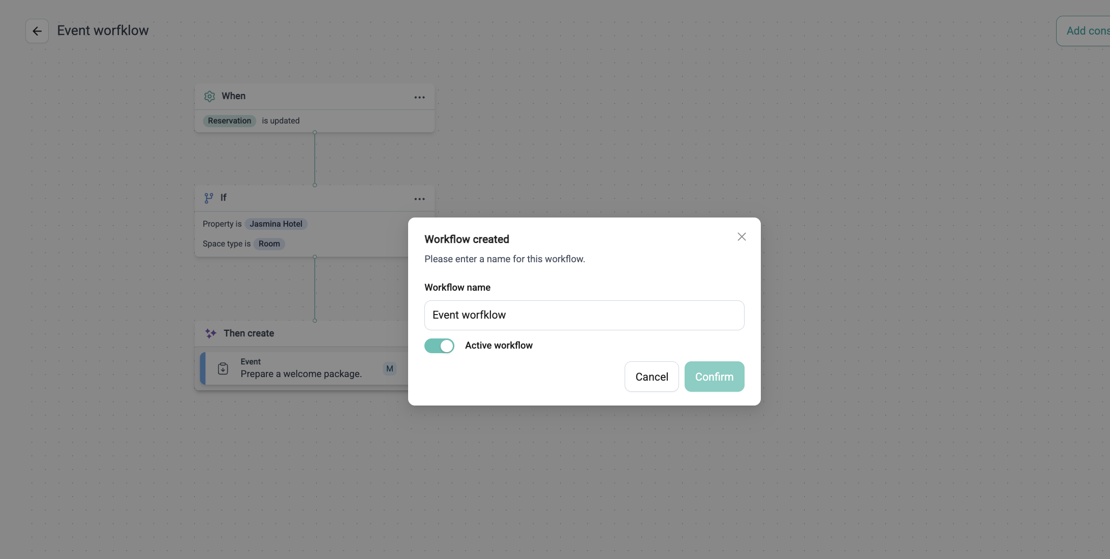 The Workflow Builder helps your hotel team create automatic workflows that save time and reduce manual work. You can set up rules so that certain tasks—like housekeeping or guest services—happen automatically when something specific occurs, like a reservation update or a VIP guest checking in.