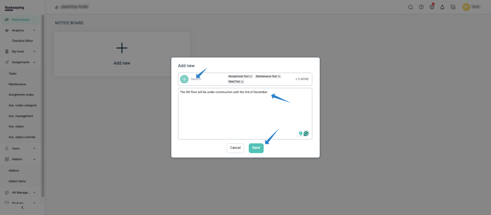 El Tablón de anuncios es una página dedicada para enviar comunicados a todo el personal del hotel, grupos específicos de usuarios o usuarios individuales.