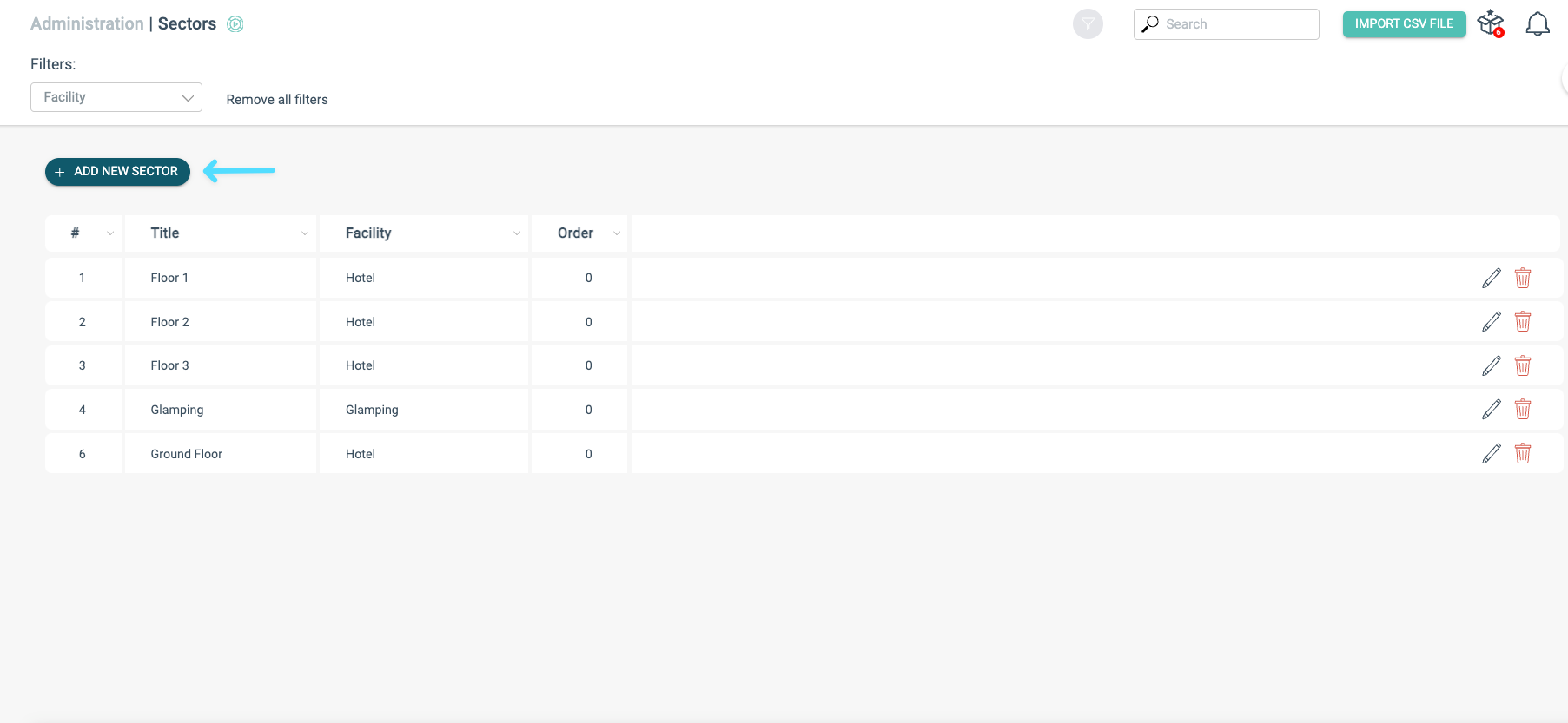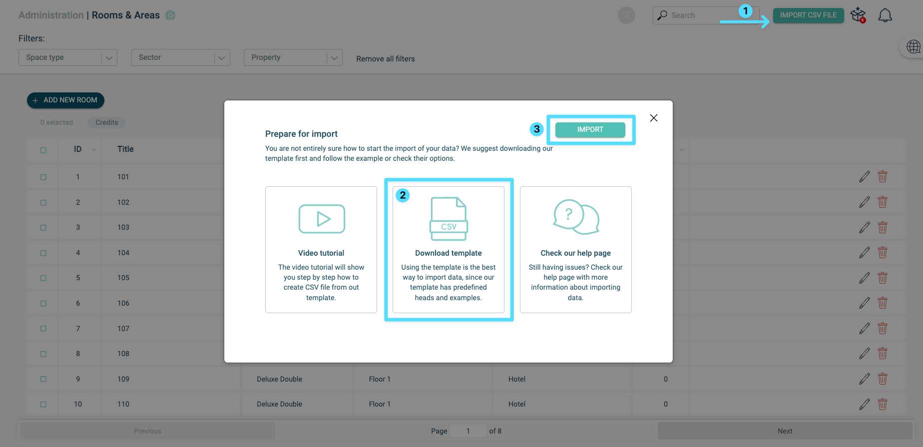 Une fois les secteurs et les types d’espaces ajoutés, la dernière étape consiste à entrer les numéros de chambre.