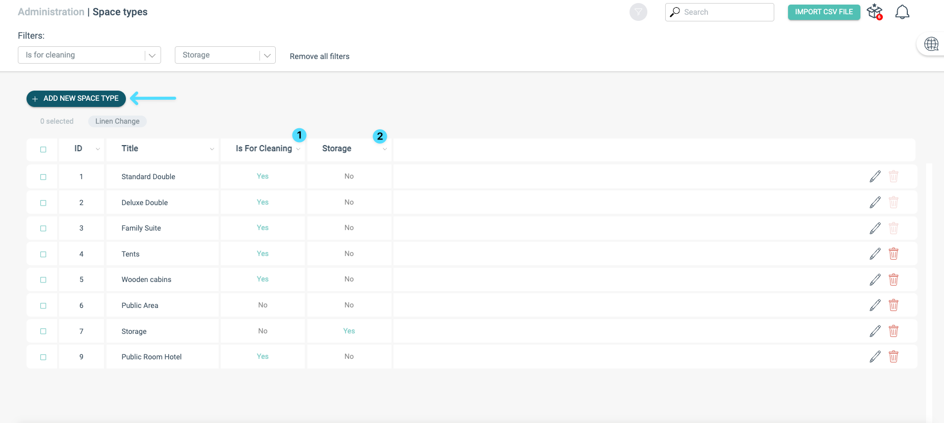 Dans la section Types d’espaces, vous pouvez ajouter différents types d’espaces qui seront associés aux chambres.