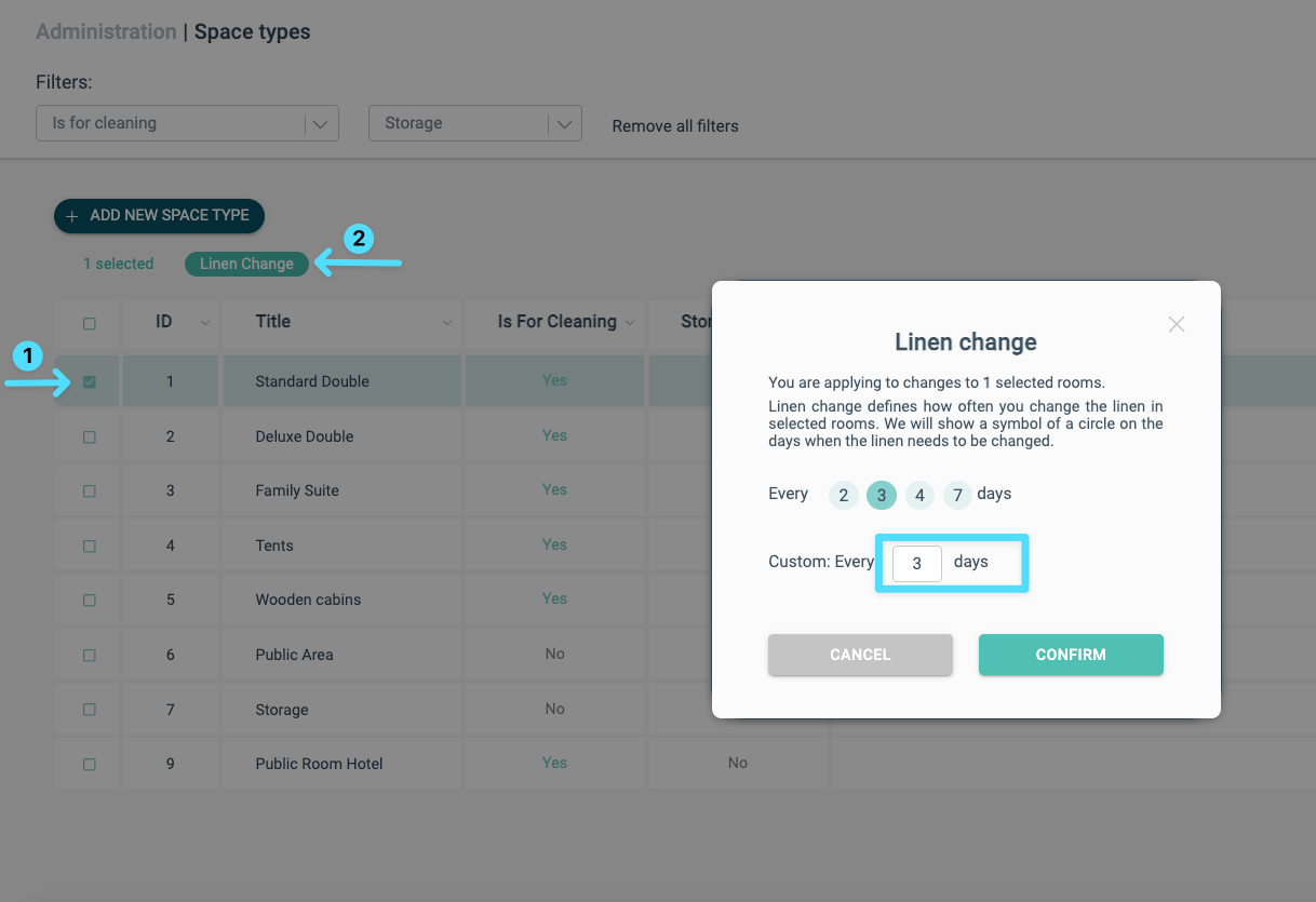 Après avoir ajouté les types de chambre, vous pouvez définir les intervalles de changement de linge pour les chambres sélectionnées.