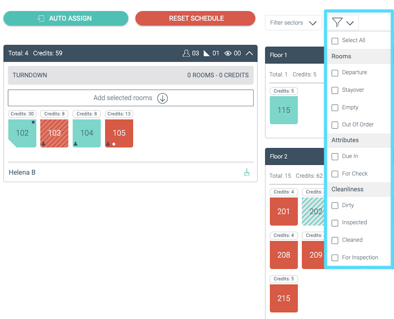 Les filtres vous permettent de réduire la liste des chambres à attribuer par secteur. À côté du bouton filtre, un symbole d’entonnoir permet de filtrer les chambres selon :