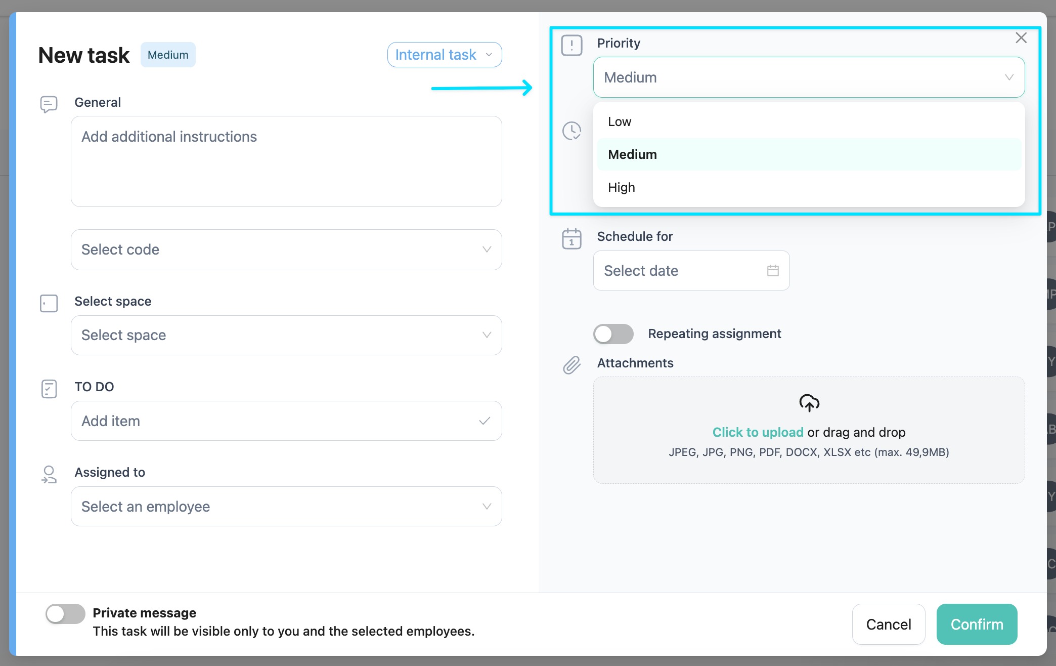 Sur cette page, vous pouvez également modifier la priorité de la tâche en sélectionnant parmi les options suivantes :