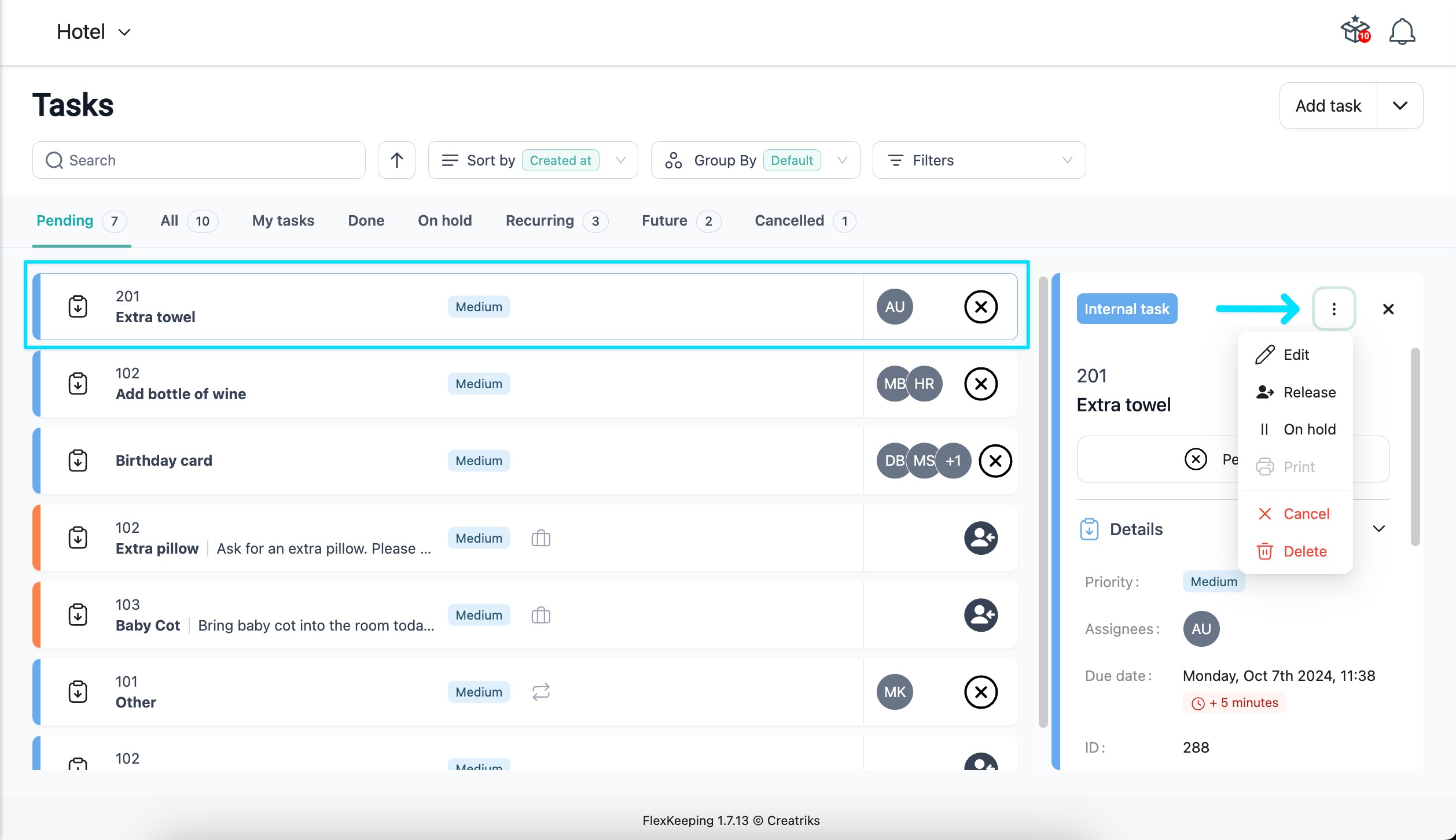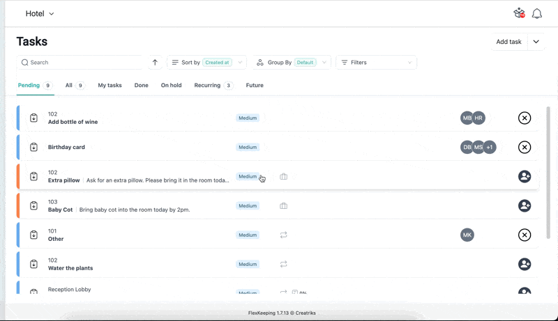 La fonctionnalité de gestion des tâches de Flexkeeping simplifie le processus de création de missions pour votre personnel, en répondant à plusieurs besoins, tels que la gestion des demandes des clients et des tâches internes à réaliser quotidiennement. Il est important de noter que toutes les tâches liées à la maintenance sont efficacement gérées via le module Réparations.