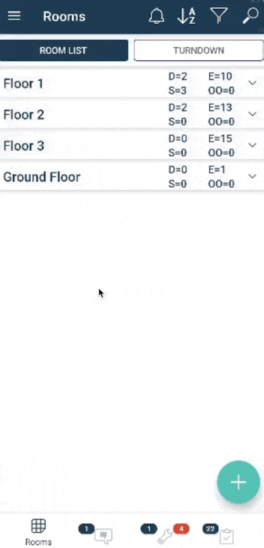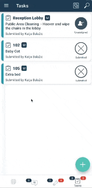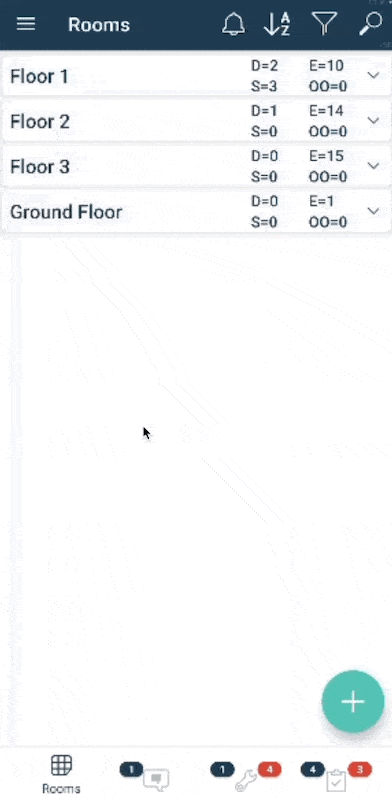 Sur l’application mobile, sélectionnez "Chambre" dans le menu. Un grand bouton vert + apparaîtra en bas à droite. Appuyez dessus pour accéder à l’option ajouter une tâche.
