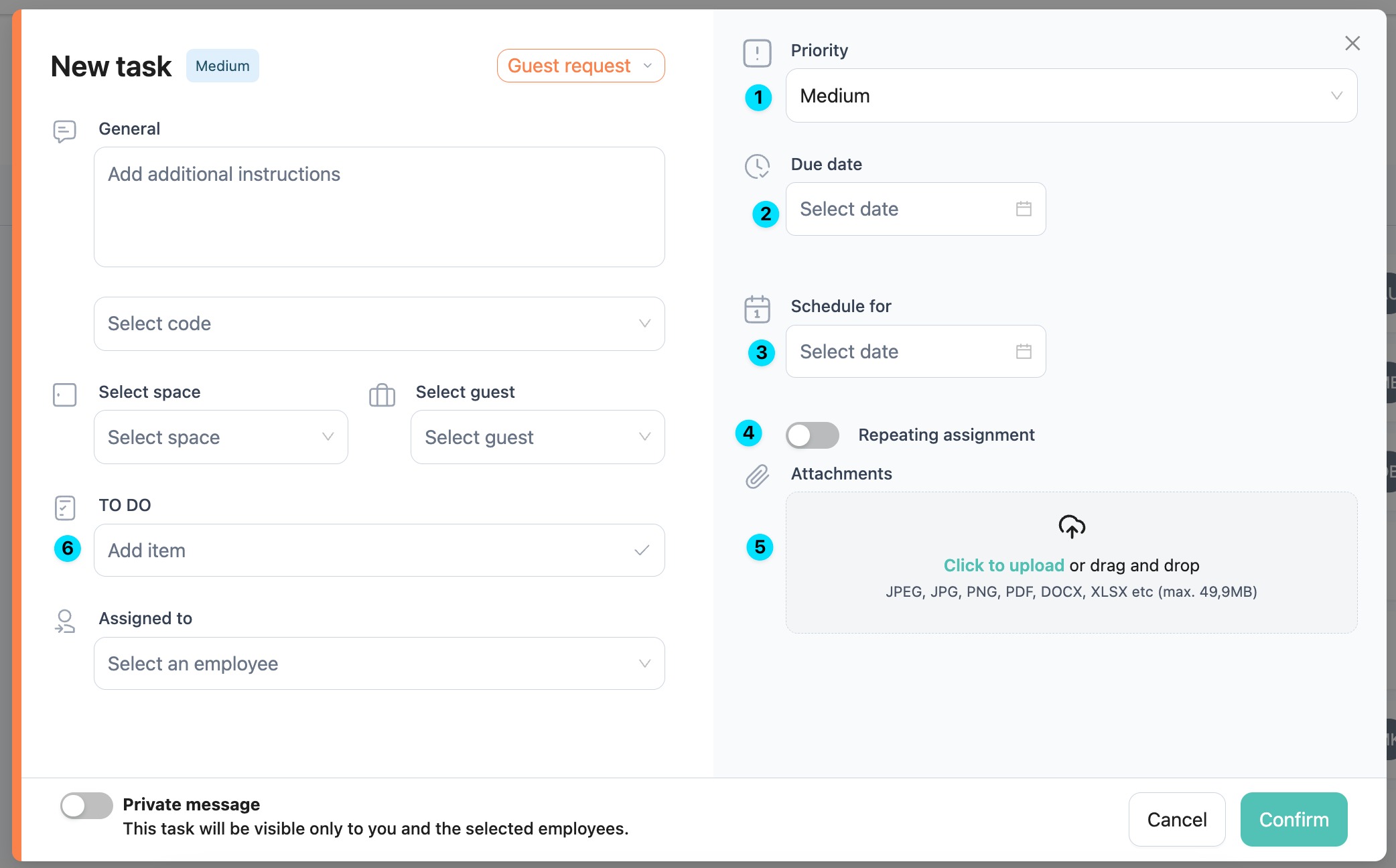 Sélection de l’espace : si la tâche concerne une chambre spécifique, sélectionnez-la dans la liste, et le personnel assigné à cette chambre sera automatiquement affecté à la tâche.