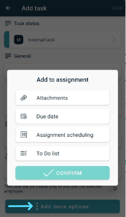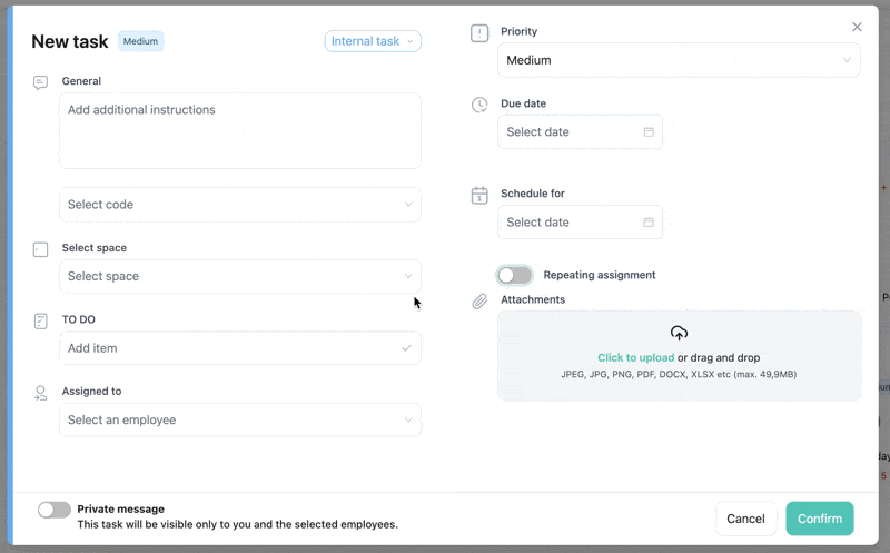 REMARQUE : Pour créer une tâche, vous devez remplir au moins une des options : espace ou personne assignée.