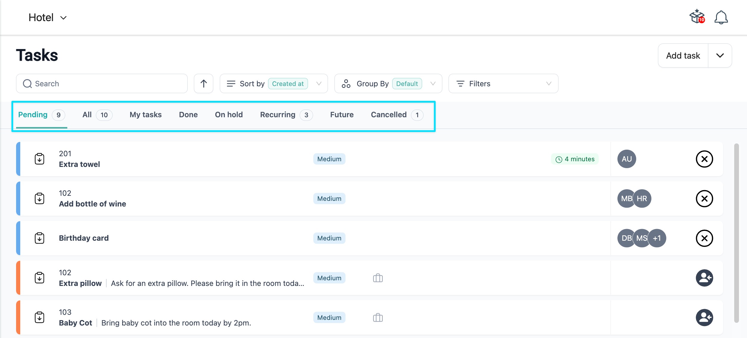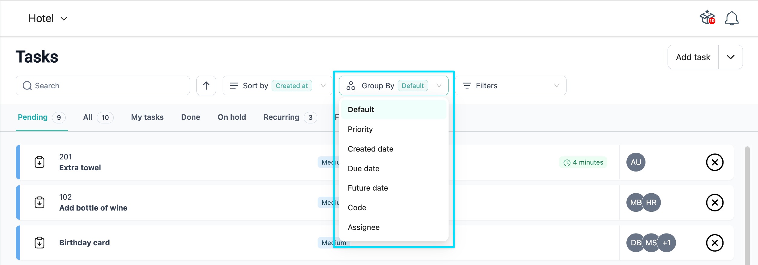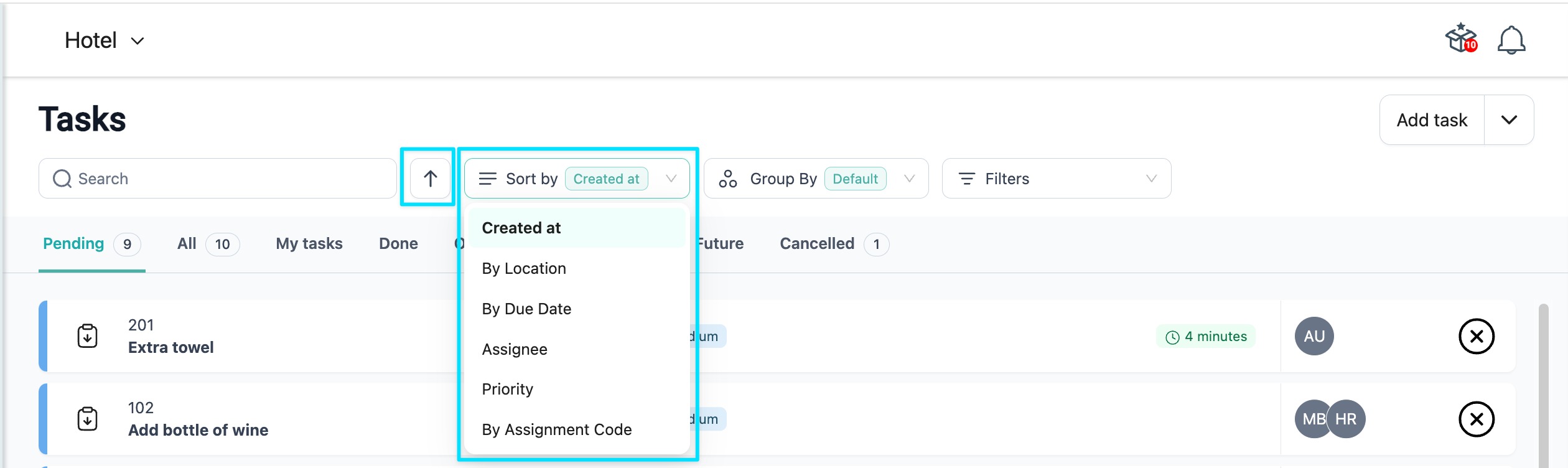 Regroupement par : cette option change la manière dont les missions sont regroupées pour une meilleure visibilité des tâches en attente.