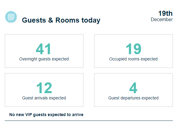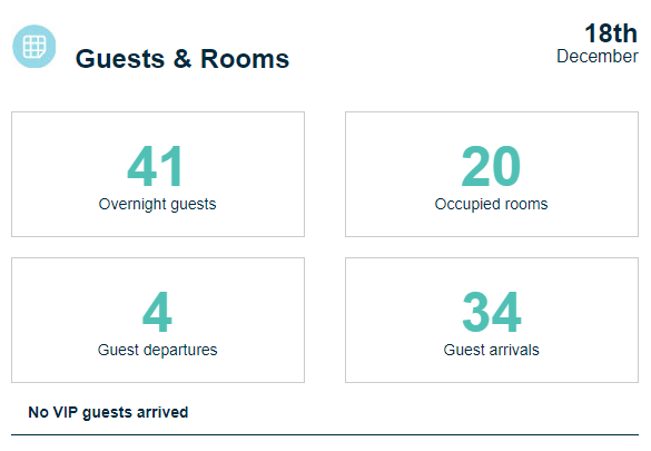 Clients VIP : tous les clients avec un statut VIP arrivés la veille seront affichés ici. Cela dépend des informations VIP envoyées par le PMS à Flexkeeping (non disponible dans toutes les intégrations PMS).