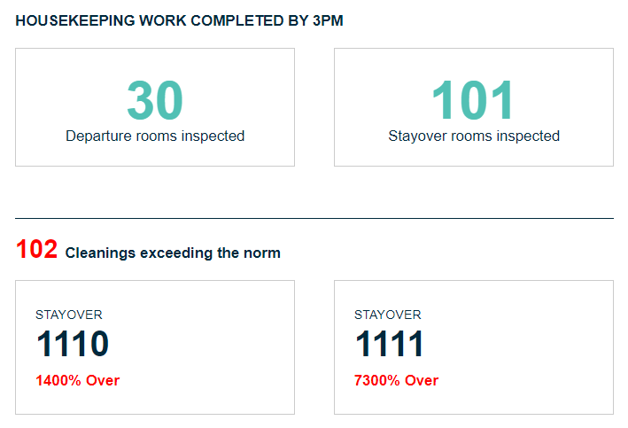 Nettoyages dépassant la norme : liste des chambres dont le nettoyage a pris plus de temps que prévu et la durée supplémentaire.