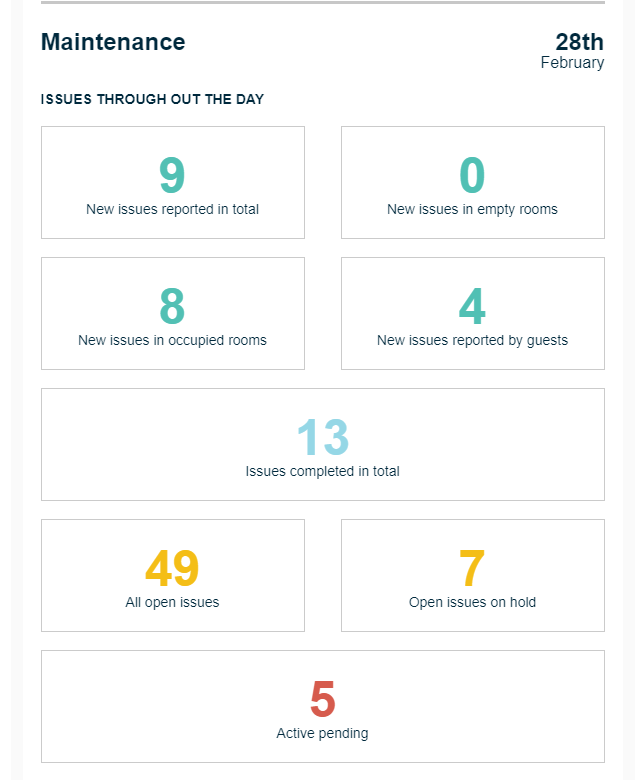 Les mêmes statistiques d’occupation que dans la première carte sont affichées ici, mais pour le jour en cours, basées sur les réservations reçues par Flexkeeping au moment de l’envoi du rapport.