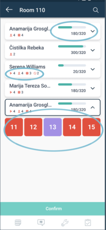Vue détaillée lors de la sélection : une liste des chambres actuellement assignées à l’agent ou à l’équipe sélectionné(e), pour aider à décider si la réaffectation est appropriée.