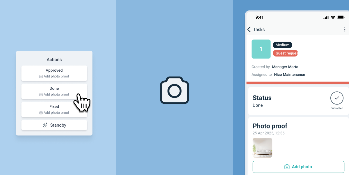 Gli utenti ora possono mostrare immediatamente la prova delle attività completate scattando una foto in tempo reale. La foto viene automaticamente caricata in Flexkeeping, così tutti i membri del team possono vedere quando un compito è stato completato. Niente più controlli manuali o follow-up lunghi. Più trasparenza, precisione e responsabilità.