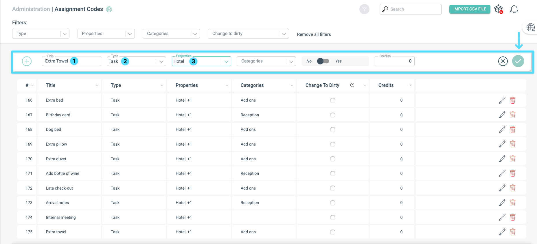 Hvis du bruker modulen for gjesterelasjoner, bør du også legge til oppgavekoder for kostnad for kvalitet og for positiv eller negativ tilbakemelding. Eksempler: