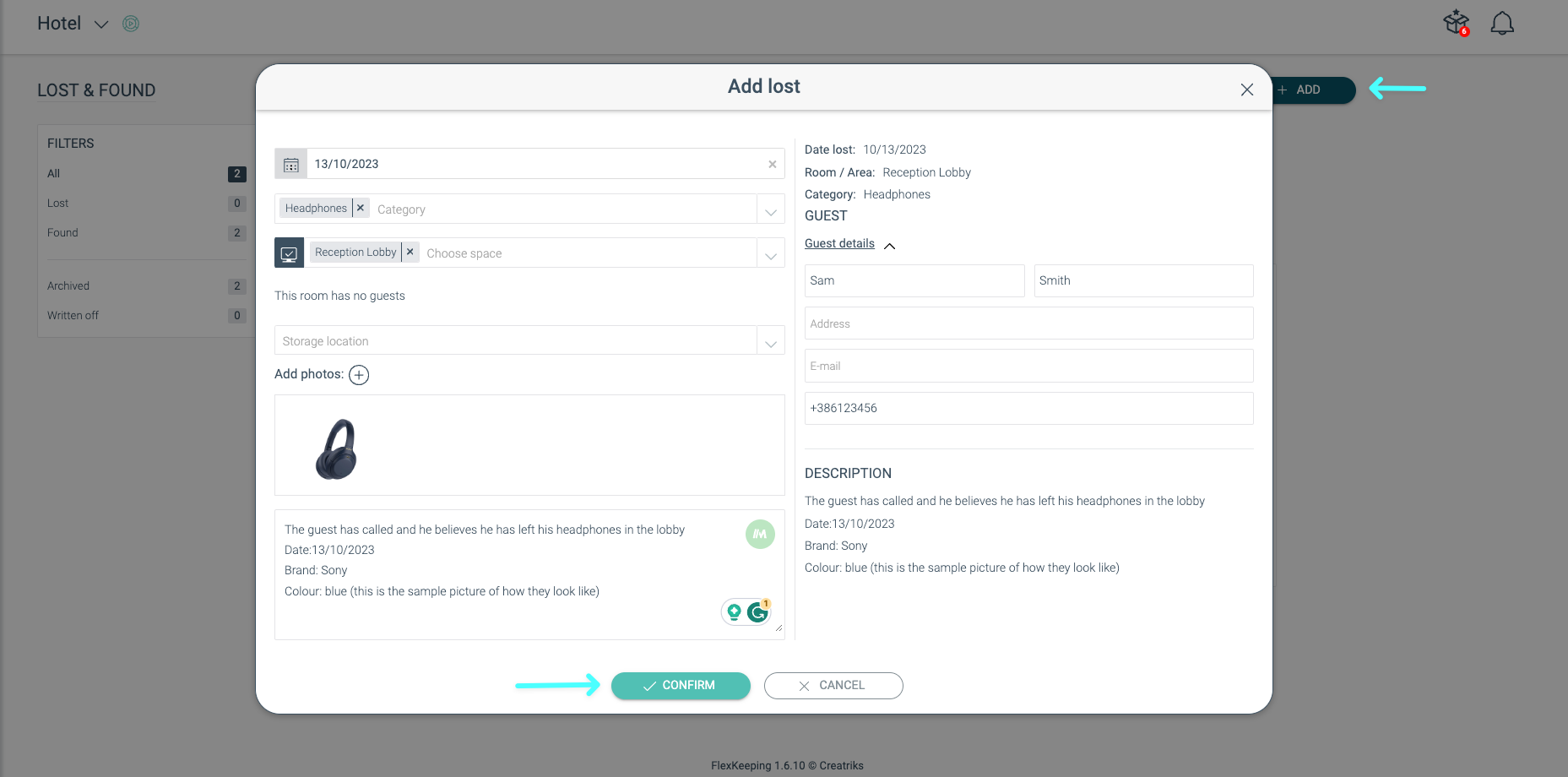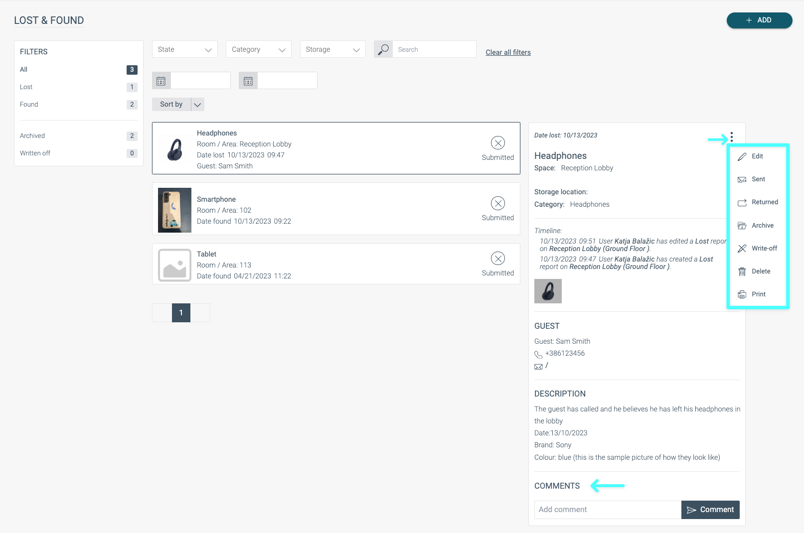 Listen over alle registrerte mistede og funnede gjenstander lagres i Lost & Found-modulen.Ved å klikke på en registrert gjenstand kan du se alle detaljene som er lagt inn.Ved å klikke på de tre prikkene får du tilgang til flere handlinger, som å redigere, sende gjenstanden, arkivere osv.