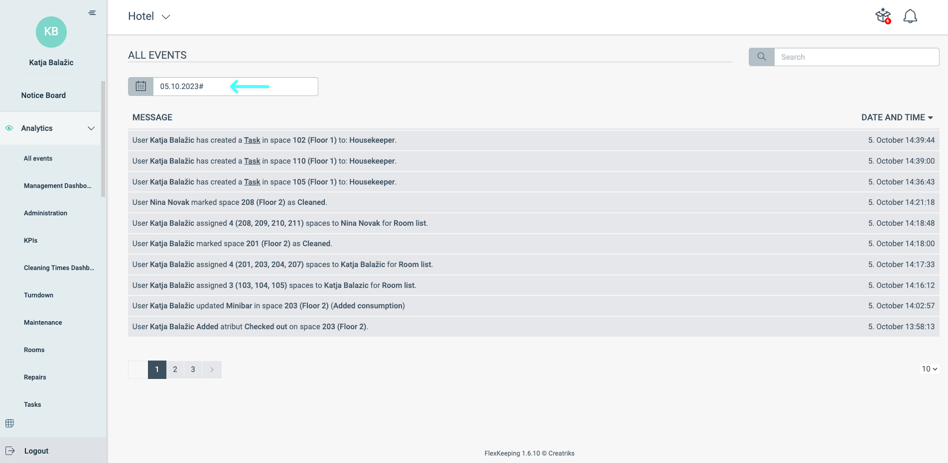 Siden har også et søkefelt, hvor man ved å skrive inn romnummer eller brukerens navn kan se alle hendelser for den aktuelle dagen som samsvarer med søkeparametrene.