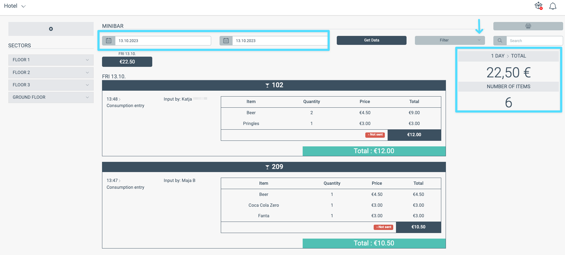 I hovedmenyen til venstre velger du Analyse, og deretter Minibar. Velg ønsket tidsperiode og klikk Hent data. Rapporten vil vise en oversikt over forbruket for alle rom i valgt periode.