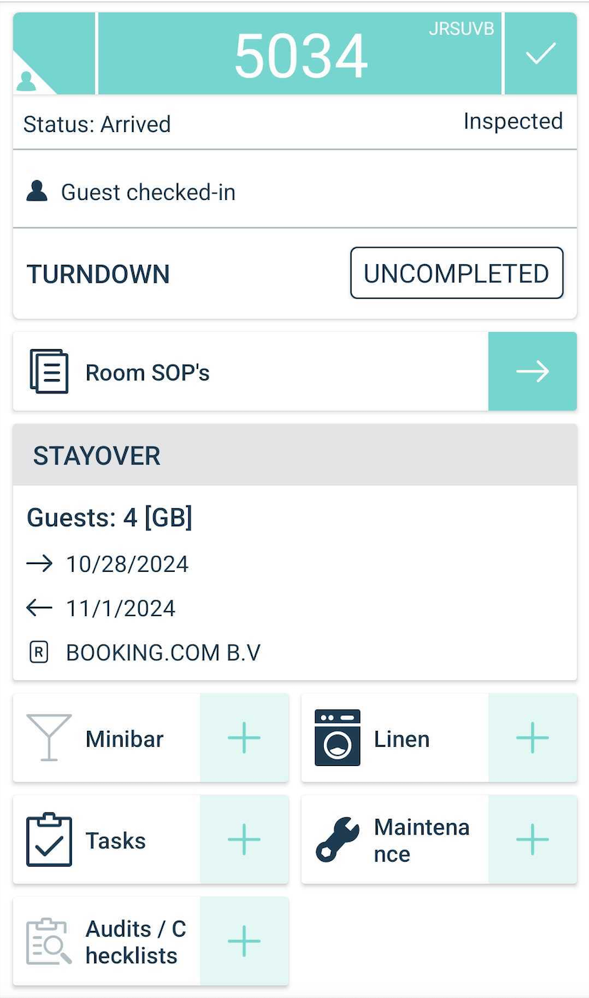 Denne siden gir en sanntidsoversikt over romstatus, gjesteinformasjon, utestående zadatke, fullførte sjekklister og registrert forbruk. For å få tilgang, trykk på hvilken som helst romflis.