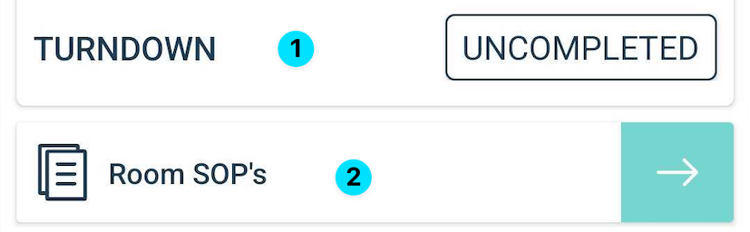 I denne delen av skjermen kan brukeren se om kveldsoppredningen er fullført eller ikke (1), samt ha enkel tilgang til romprosedyrer (SOPs) (2).