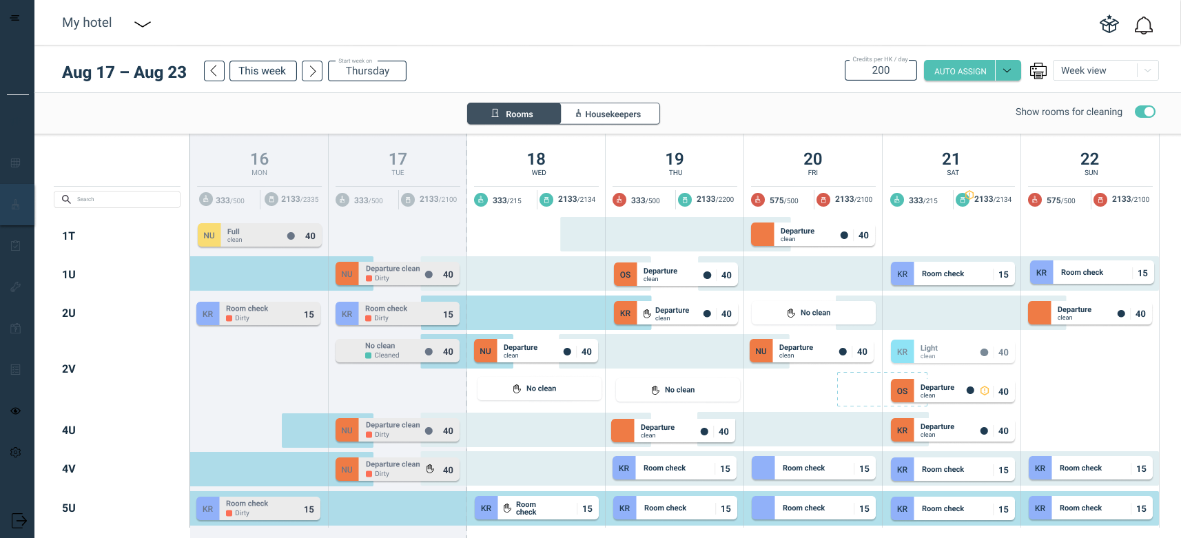Endelig renholdsstatus: Sjekk rommets renholdsstatus ved slutten av dagen, vist med de vanlige fargekodene.