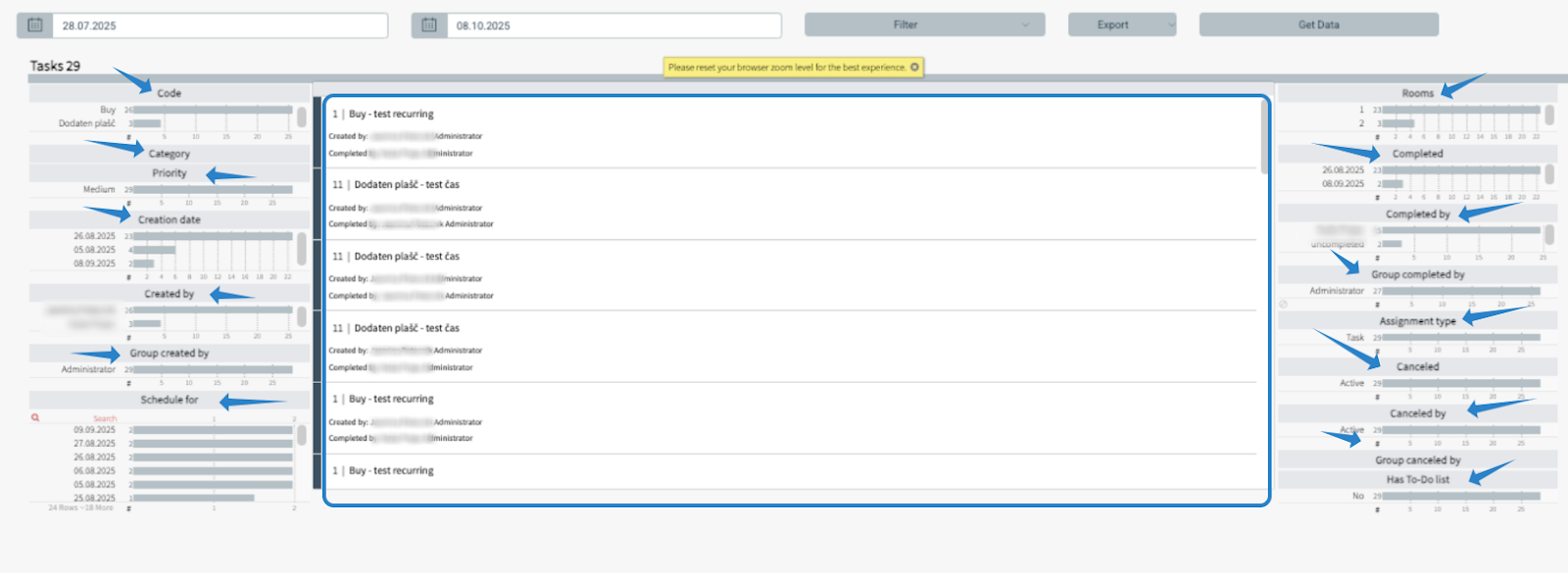 - Opprettet på valgte datoer – Oppgaver opprettet innenfor valgt tidsperiode.
